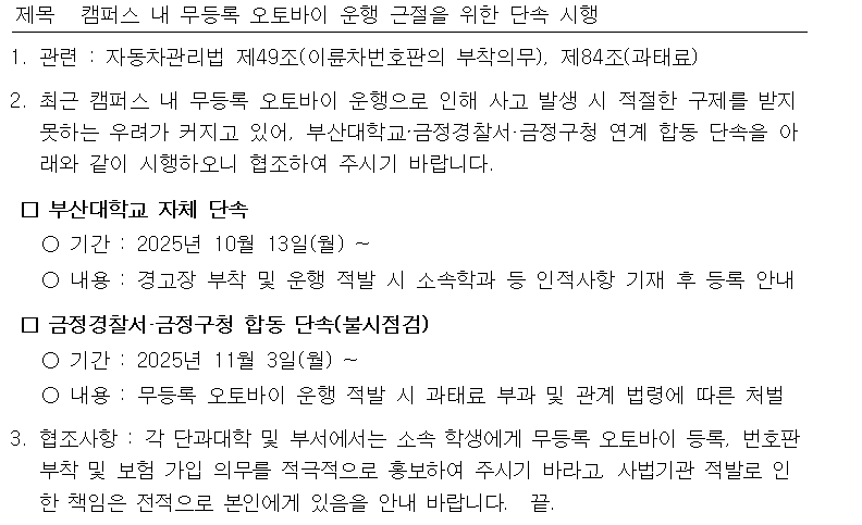 fnctId=bbs,fnctNo=4001 캠퍼스 내 무등록 오토바이 운행 근절을 위한 단속 시행 안내 date 2025.10.13 name 이현정 e-mail view 14 첨부파일 첨부파일이(가) 없습니다.