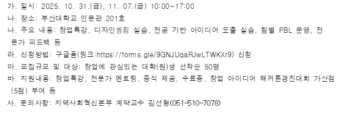 fnctId=bbs,fnctNo=4001 인문창업 스쿨 운영 안내 date 2025.10.14 name 이현정 e-mail view 17 신청서 제출 기한: 10/24(금)까지 첨부파일 붙임1. 인문창업 스쿨 학생모집공고.pdf 미리보기