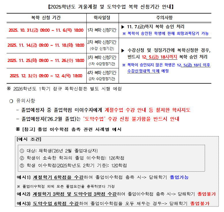 fnctId=bbs,fnctNo=4001 2025학년도 겨울계절 및 도약수업 운영에 따른 복학 신청기간 알림 date 2025.10.22 name 이현정 e-mail view 13 첨부파일 2025학년도 겨울계절 및 도약수업 수강대상자 복학 신청기간 안내.pdf 미리보기