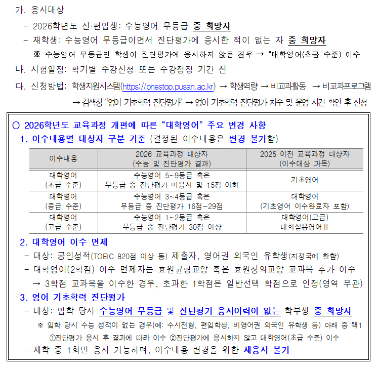 fnctId=bbs,fnctNo=4001 2026학년도 영어 기초학력 진단평가 실시 안내 date 2025.12.24 name 이현정 e-mail view 10 첨부파일 2026학년도 영어 기초학력 진단평가 안내.hwp 미리보기