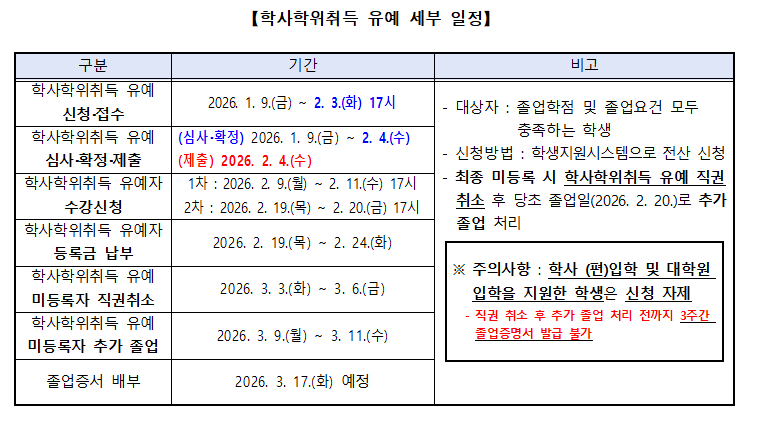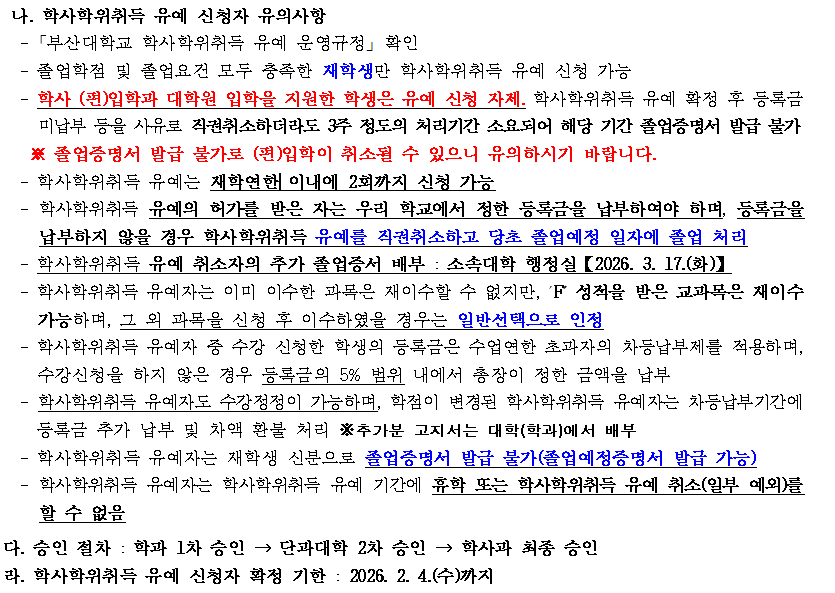 fnctId=bbs,fnctNo=4001 2025학년도 전기('26년 2월) 학사학위취득 유예 시행 계획 알림 date 2025.12.29 name 이현정 e-mail view 32 첨부파일 첨부파일이(가) 없습니다.