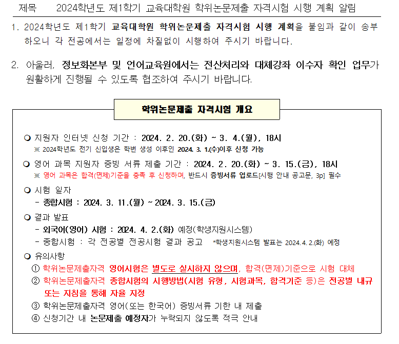 fnctId=bbs,fnctNo=4000 2024학년도 제1학기 교육대학원 학위논문제출 자격시험 시행 계획 알림 date 2024.02.14 name 이현정 e-mail view 991 첨부파일 2. 2024학년도 제1학기 학위논문제출 자격시험 시행 안내(공고용).hwp 미리보기