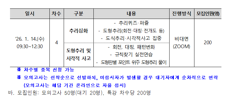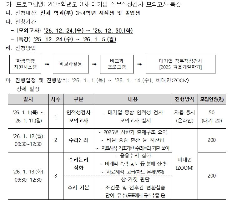 fnctId=bbs,fnctNo=4016 [국립대육성] 2025학년도 3차 대기업 직무적성검사 모의고사·특강 안내 date 2025.12.24 name 이현정 e-mail view 10 첨부파일 2025학년도 3차 대기업 직무적성검사 모의고사, 특강 실시 안내문.hwp 미리보기